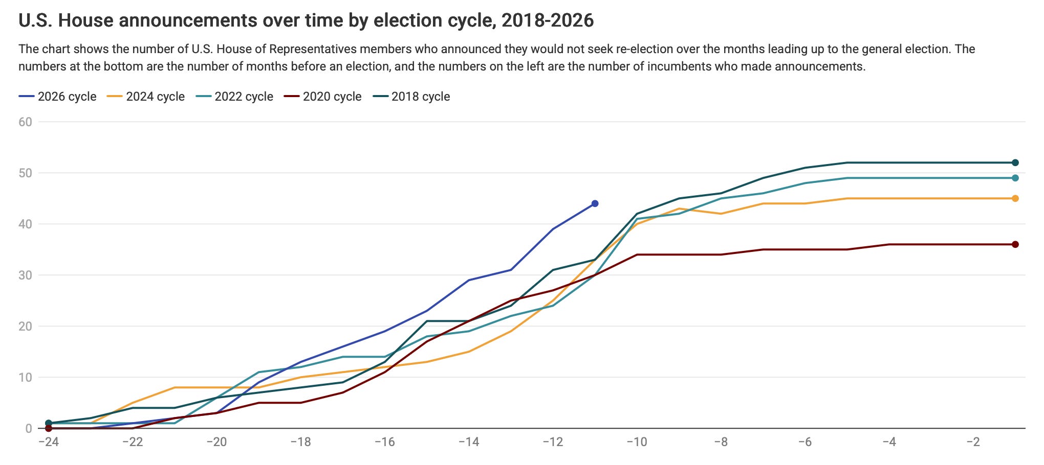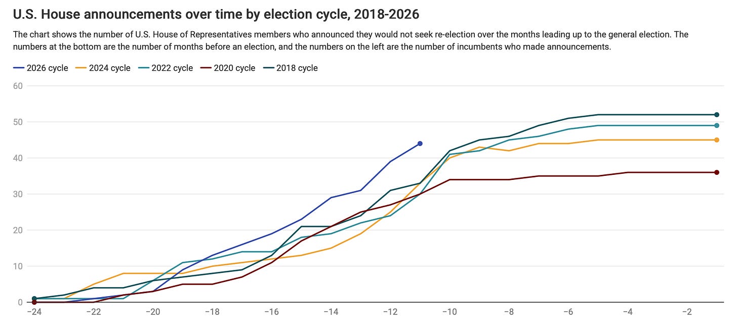 Incumbents are retiring at a record pace in 2025, including Nancy Pelosi and Mitch McConnell. Some of the resignations could have major implications for next year’s midterms, involving incumbents in crucial swing seats (Jared Golden of ME-02, Don Bacon of NE-02, Thom Tillis of North Carolina).