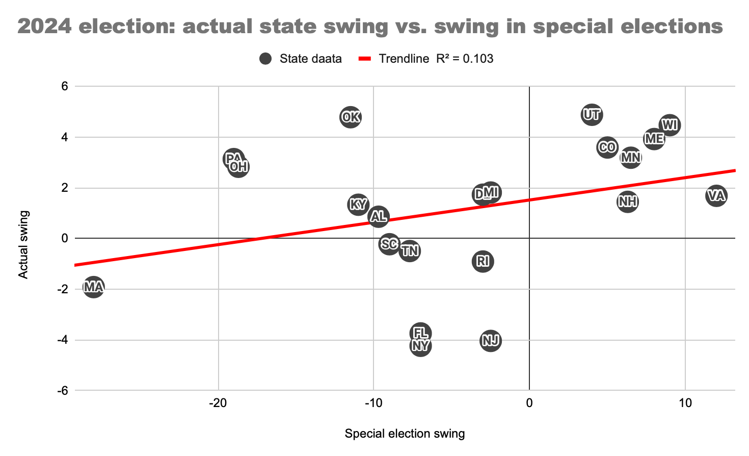 With midterms around the corner, special elections can offer direct, if limited, insights into voter sentiments straight from the ballot box. Based on data compiled by the Downballot, swings in the national House vote in midterm years have correlated reasonably well with special election shifts (I wrote about this in more detail here). Of course, US politics is about winning key states, not the national vote. Special elections could provide some insights at the state level, too, but the correlation looks pretty weak.